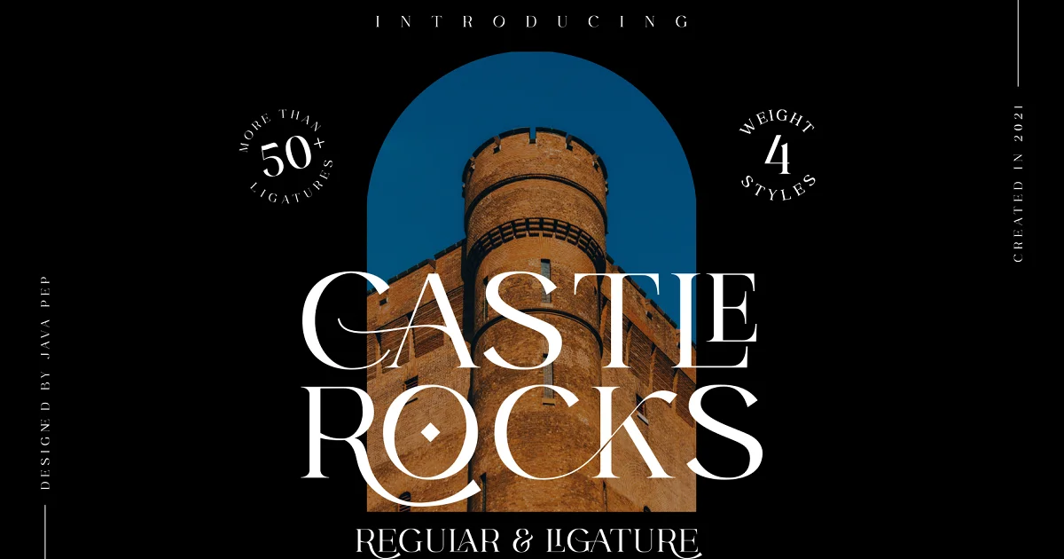 - CASTLE ROCKS DUO (Phông chữ thông thường), font chữ thông thường này không có tính năng ghép nối để bạn có thể kết hợp với CASTLE ROCKS hoặc sử dụng để làm font chữ văn bản, phông chữ này có 4 kiểu chữ regular, italic, bold, và bold italic.