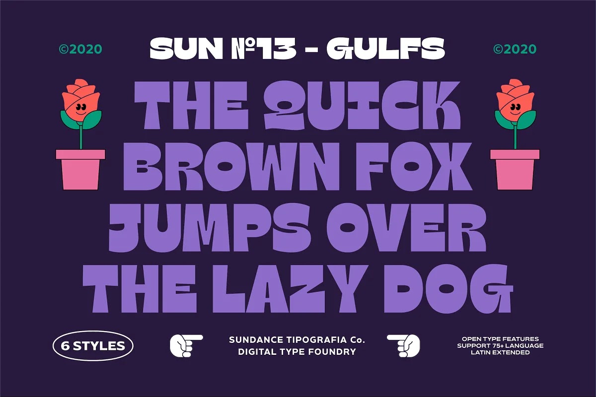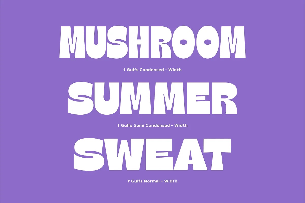 Gulfs Display lấy cảm hứng từ truyện tranh và phim hoạt hình vui nhộn của thập niên 90. Font chữ vui nhộn này có 6 width: condensed, semi condensed, normal, semi expanded, expanded và extra expanded. Font chữ này có thể được sử dụng cho các thiết kế hiện đại và cổ điển, cũng có thể dễ dàng ghép nối với một số yếu tố đồ họa (Hình minh họa, Nhiếp ảnh) phông chữ này hoàn hảo cho Biểu trưng, Thương hiệu, Tiêu đề và Bao bì.