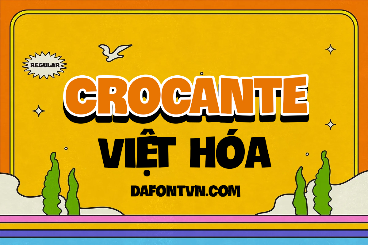 Font Crocante Việt hóa là một font chữ hiển thị ấn tượng và hài hước. Bạn có thể sử dụng font chữ này cho rất nhiều thiết kế. Font chữ được Việt hóa bởi iCiel.
