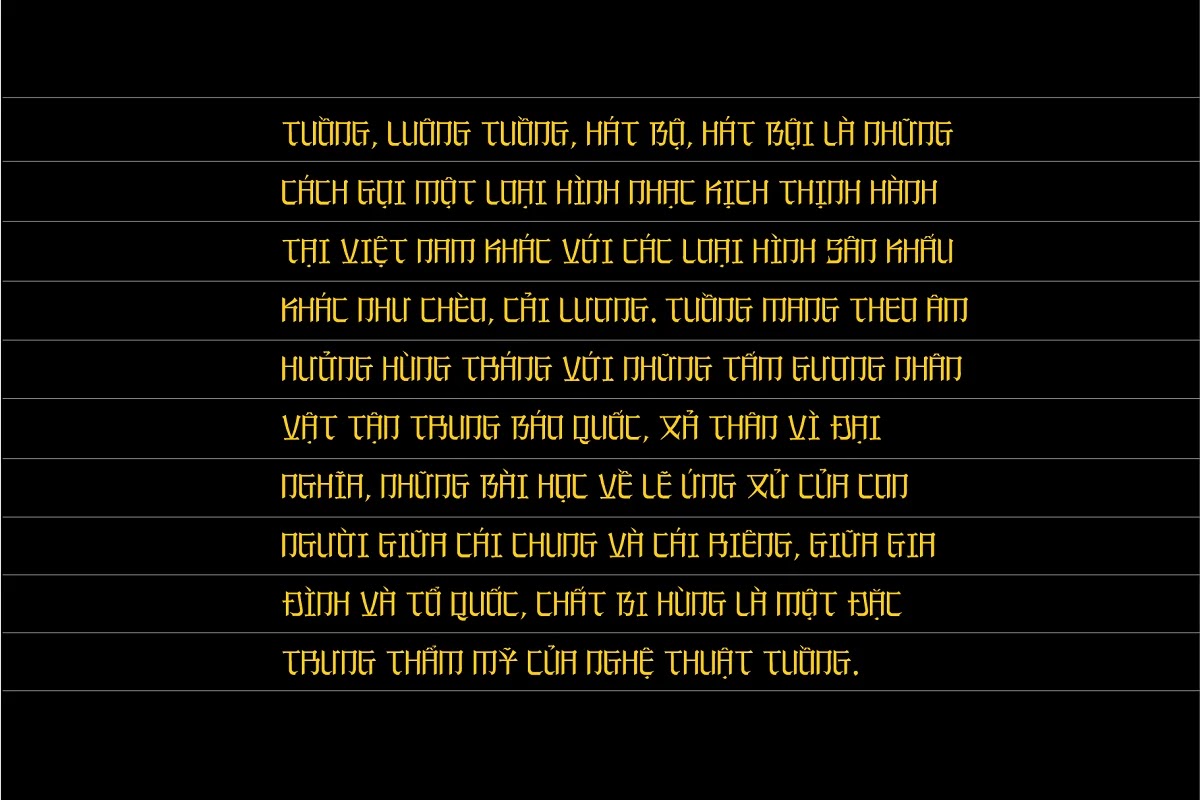 LUONG TUONG là một font chữ tiếng Việt thông dụng là Hán Nôm được thiết kế bởi Trung Dung. Typeface này là 1 phần nhỏ trong project Tuồng của Dũng. Một font khá ấn tượng. Kiểu chữ này là tuyệt vời cho dự án văn hóa truyền thống!